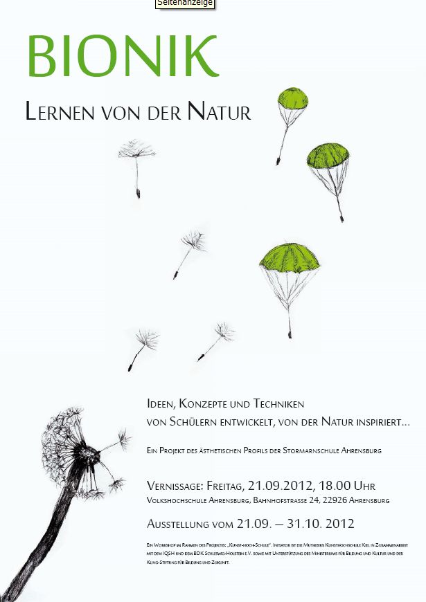 Die Natur war für Designer, Künstler und Architekten immer schon Inspiration und Vorbild. Auch die Schülerinnen und Schüler der 12b der Stormarnschule haben mit dem Designer Nicolas Uphaus und der Kunsterzieherin Anke Sommer die Natur mit Fotoapparat und Zeichenstift erkundet und die entdeckten Prinzipien in spannende und innovative Modelle transferiert. Die ungewöhnlichen und vielfältigen Ergebnisse dieser Auseinandersetzung wurden am Freitag, 21.09.2012 um 18:00 im Haus der VHS auf einer Vernissage präsentiert.