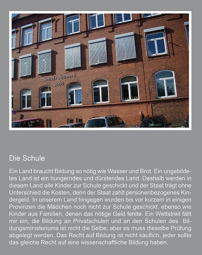 Aufgrund der Rechtslage ist der Aktionsradius der Frauen stark eingeschränkt, sie dürfen, während sie in der Aufnahmeeinrichtung leben müssen, den zugewiesenen Aufenthaltsbereich nicht ohne Erlaubnis verlassen, sie erhalten die sehr eingeschränkten staatlichen Transferleistungen nach dem Asylbewerberleistungsgesetz und dürfen an Integrationsangeboten nicht teilnehmen, lediglich Beratungsangebote annehmen. Auf Initiative des Autonomen Frauenhauses Neumünster und in Kooperation mit dem Beauftragten für Flüchtlings-, Asyl- und Zuwanderungsfragen des Landes Schleswig-Holstein hat die Flüchtlingsberatung des Diakonisches Werkes Altholstein eine Gruppe mit interessierten Flüchtlingsfrauen gebildet, um deren speziellen Blick auf das aufnehmende Land zu zeigen. Mit Einwegkameras haben diese Frauen aus unterschiedlichen Herkunftsländern ihre Gefühle, Eindrücke, Ängste und Sehnsüchte durch Fotografien ausgedrückt und kurze Texte dazu geschrieben.
