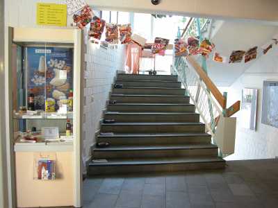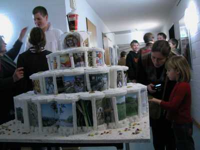 ![]() Das Ausstellungsobjekt "Die Welt" von Sina Aden, Juliane Kraft und Andreas Bollingberg-Wörzner wurde zunächst nur optisch begutachtet. Am nächsten Tag wurde von einer kleinen Besucherin die Frage, ob der Untergrund aus Mehl oder Zucker sei, durch einen Geschmackstest hinreichend geklärt. Noch am selben Tag wurde auch ein EDV-Dozent beim Testen eines Smarties beobachtet. |