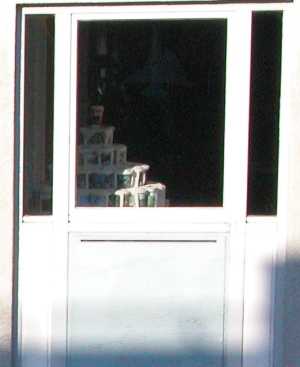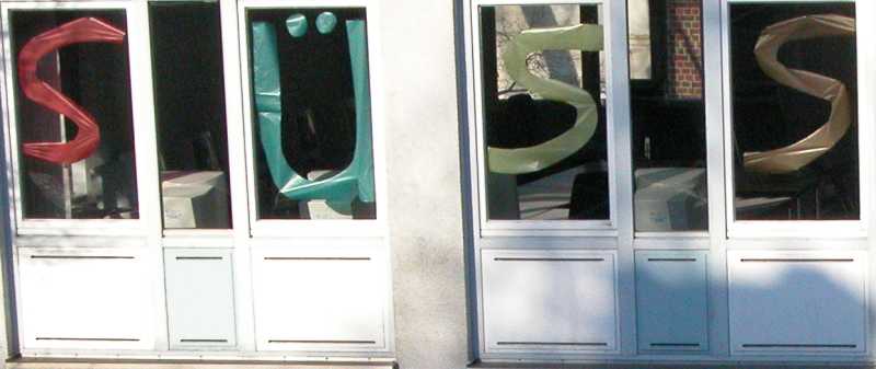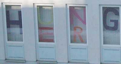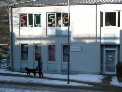 ![]() Die Fensterfront zur Bahnhofstraße wies auf das spannende Ereignis hin. Nur ein Teil des Fußweges wurde durch die Hausmeisterin vom Zucker geräumt. |